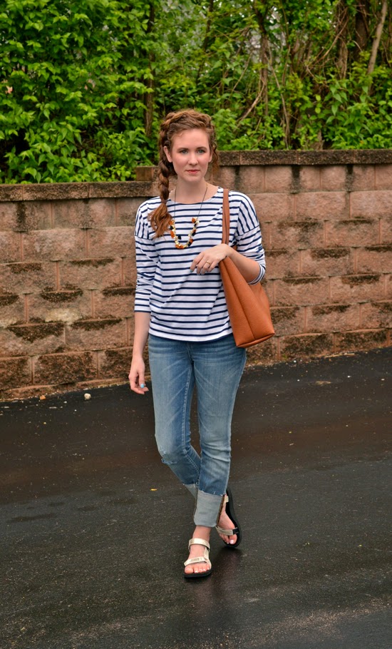 I bought this tote in the pink/tan color combo, and have been using it non-stop this spring! Your jeans look so cute and comfy, and I love your hair!